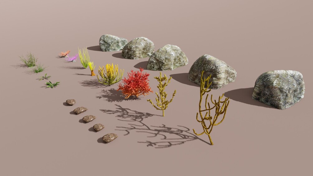 All the assets are in blend bundle and not exportable (1 red coral, 5 anemones, 2 algaes, 5 pebbles, 5 rocks, 4 grass, 10 fishes pics).
